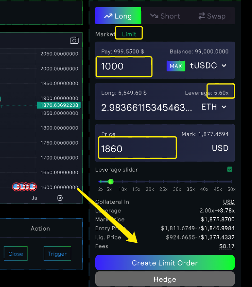 Once your wallet is connected, navigate to the trade page. Here, you'll find your positions and discover the new features of "Limit Order" and "Trigger Order".