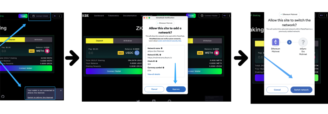 * Visit [zkDX Staking](https://app.zkdx.io/stakingliquidity), click to connect your wallet.